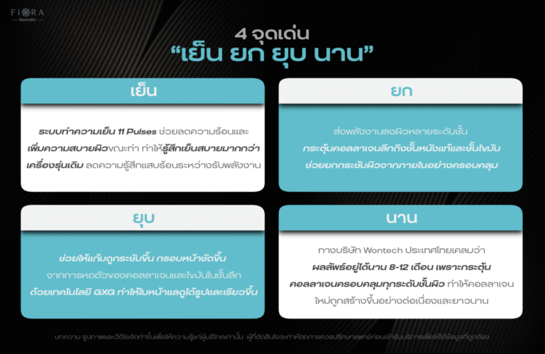 – นาน – ทางบริษัท Wontech ประเทศไทยเคลมว่าผลลัพธ์อยู่ได้นาน 8-12 เดือน เพราะกระตุ้นคอลลาเจนครอบคลุมทุกระดับชั้นผิว ทำให้คอลลาเจนใหม่ถูกสร้างขึ้นอย่างต่อเนื่องและยาวนาน
